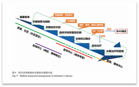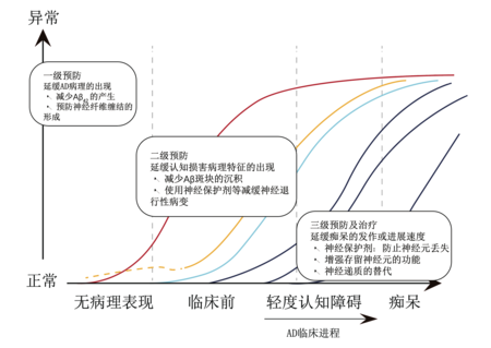 AD及其它痴呆的防控关口必须前移,从针对尚未出现AD病理改变和临床症状的中老年人群识别和管理可控危险因素的一级预防,到基于临床前阶段或已经发生轻度认知功能障碍人群的早期诊断及早期干预的二级预防,以提高对AD早期预防的重视,从而避免或延缓AD相关的病理改变,降低AD发病风险(Ⅰ级证据)。